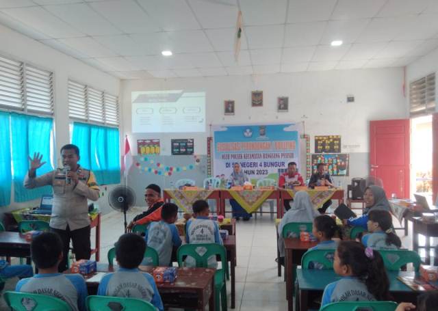 MERANTI, VokalOnline.Com - Bhabinkamtibmas Desa Kedabu Rapat Polsek Rangsang Polres Kepulauan Meranti Polda Riau, Aiptu Andri Kurniawan SH, Sabtu (14/10/2023) memberikan sosialisasi perundungan (Bullying) di SD Negeri 004 Bungur Kecamatan, Rangsang Pesisir.