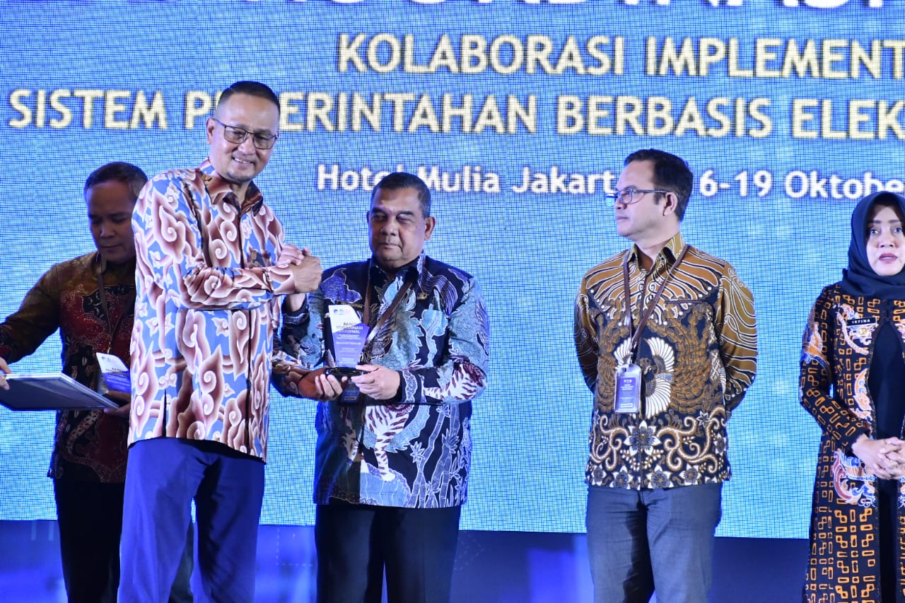 Penghargaan diterima Wakil Gubernur Riau (Wagubri) Edy Natar Nasution pada Rakornas Kolaborasi Implementasi Sistem Pemerintahan Berbasis Elektronik (SPBE) yang ditaja Kementerian Kominfo RI, di Hotel Mulia, Senayan, Jakarta pada Selasa (17/10/23).